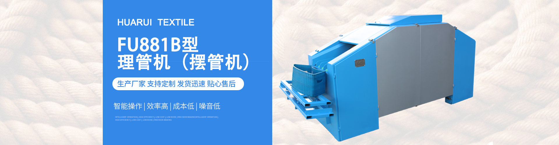 天長市華瑞紡織輔機有限公司,是集紡織輔機及紡織安裝工具、科研、生產、銷售為一體的民營企業,公司擁有雄厚的技術力量和生產能力,歷經數年的艱苦創業和迅速發展,現擁有各類紡織輔機制造應用技術,公司在發展的同時,不斷更新技術和設備改造升級,努力在紡機領域做到有所作為,我公司目前生產的新型皮輥房輔機、梳棉輔機、理管機、粗紗頭開松機、錠子加油機、絨輥清潔機及紡織安裝專用工具等系列產品得到業界的廣泛應用,產品暢銷30多個省市區及世界各地等國家,構建了由多家經銷商和上千家直銷客戶組成的全國銷...